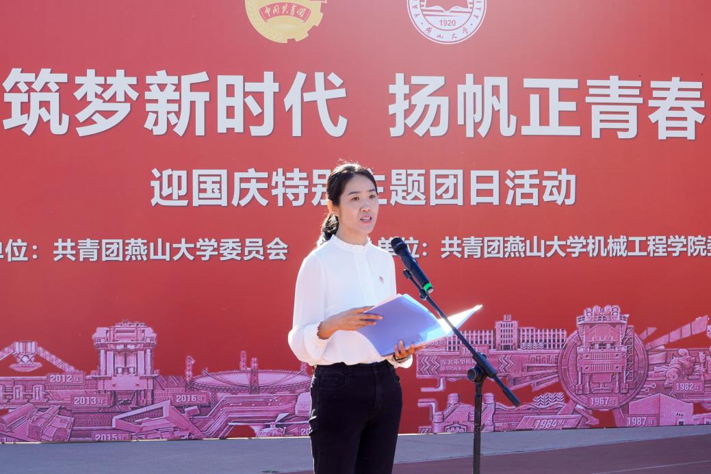 校团委书记段磊为全场师生代表讲授微团课。她讲述了燕大人的奋斗史、拼搏史,勉励青年学生能够发扬燕大人特有的精神品格,做能吃苦、肯奋斗的新时代好青年,在最美的年华,驰而不息。