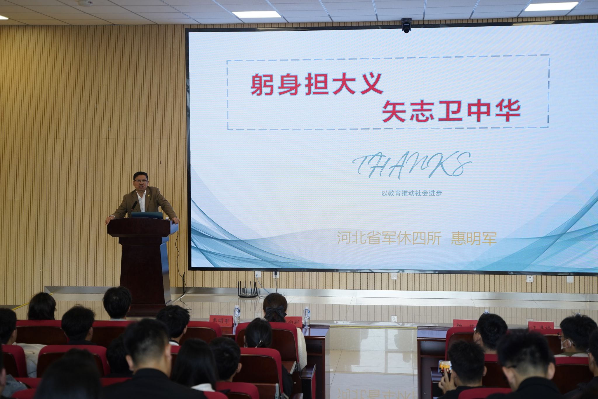 活动中,河北省军休四所军休干部、秦皇岛市全民国防教育特聘宣讲教员惠明军作了题为“躬身担大义 矢志卫中华”的国防教育讲座。他从身边的小事引发同学们的思考,结合自身军旅生涯的亲身经历,阐述战争样式演变、军事行动的突然性和兵法在历史发展中的重要作用,突出了精神力量的重要意义,讲述了革命先烈的英勇事迹和国防建设的重要地位,引导同学们深刻理解“国家兴亡、匹夫有责”的深刻内涵。讲座中,惠明军教员用一个个鲜活的例子,展现了国防事业的重要性和紧迫性,激发了在场师生的强烈共鸣。