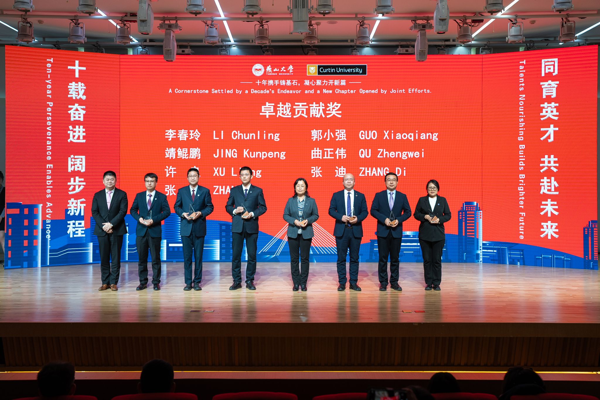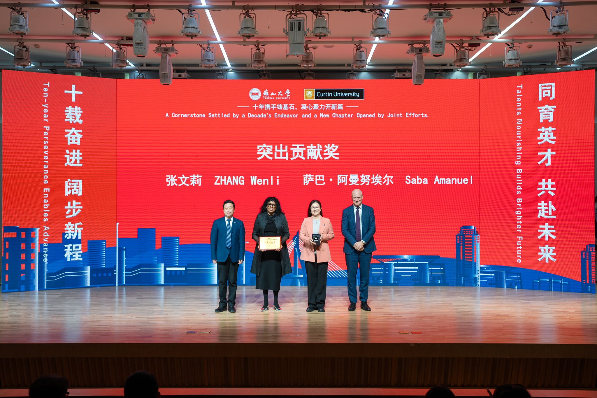 -科廷大学合作办学十周年高质量发展大会艺术展演暨颁奖典礼在西校区音乐厅举行。我校经济管理学院院长李春玲,副院长靖鲲鹏,项目负责人许良、张旭,电气工程学院副院长郭小强,项目负责人曲正伟、张迪荣获卓越贡献奖;国际教育学院(欧洲学院)院长张文莉荣获突出贡献奖。赵险峰、马修•汤茨(Matthew Tonts)、陈国强、张啸天为获奖人员颁奖。