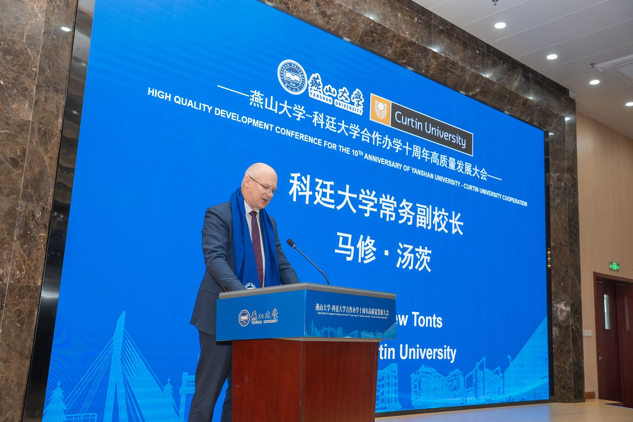 赵险峰在开幕式上致辞,高度赞扬了两校合作办学十年来的卓越成就。他指出,双方高校以开放包容的姿态,深度融合高等教育资源,在人才培养、科研合作、师资交流等方面收获了沉甸甸的合作成果,为培养具有国际视野和全球竞争力的国际化人才作出了贡献。期待两校继续深挖办学优势、拓宽合作领域、携手共赢发展,提升两校合作办学的新高度、开启两校合作办学新篇章。