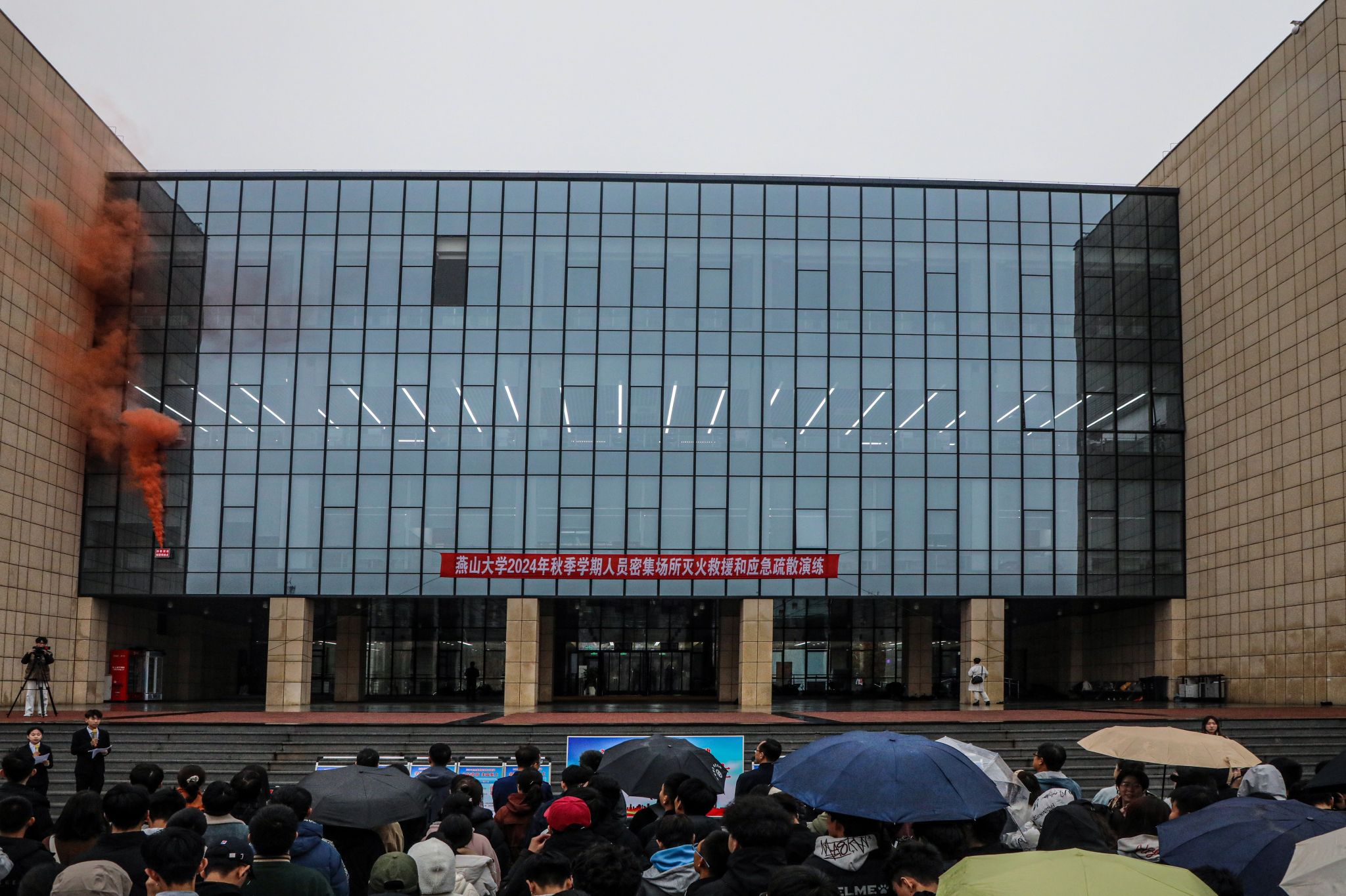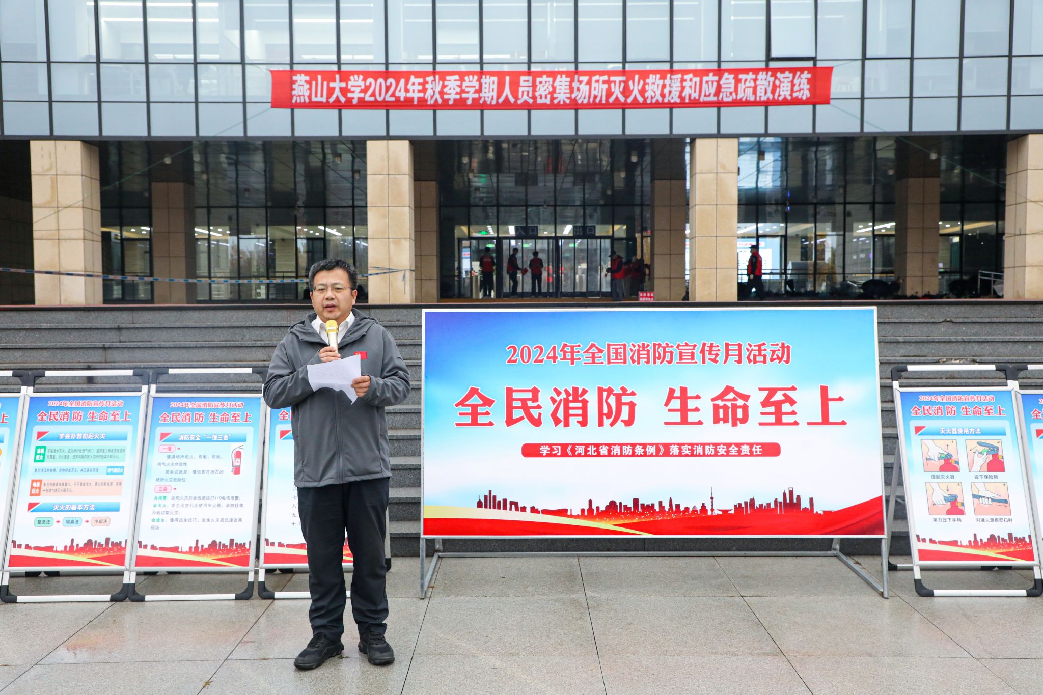2024年秋季学期灭火救援和应急疏散演练。我校消防值班员、楼宇安全管理员、各单位安全网格管理人和师生代表共计1000余人参加和观摩了此次演练。学校党委常委、副校长蔡星周、秦皇岛市消防救援支队副支队长张鹏以及学校相关部门负责人出席了本次活动。